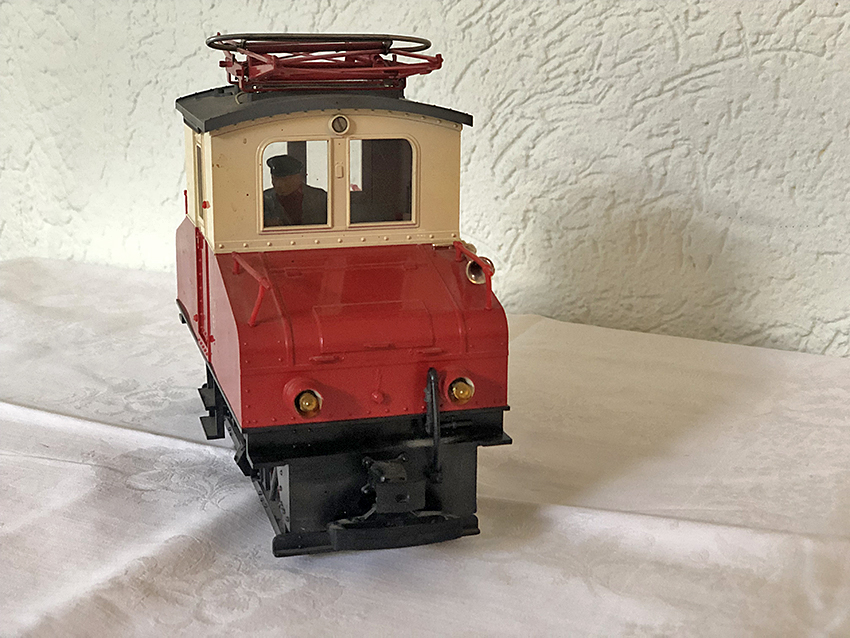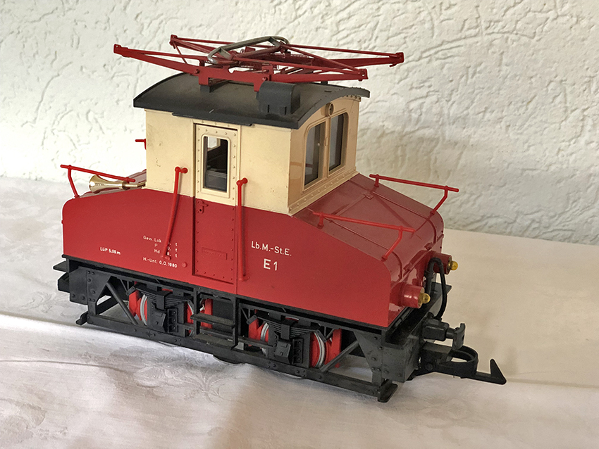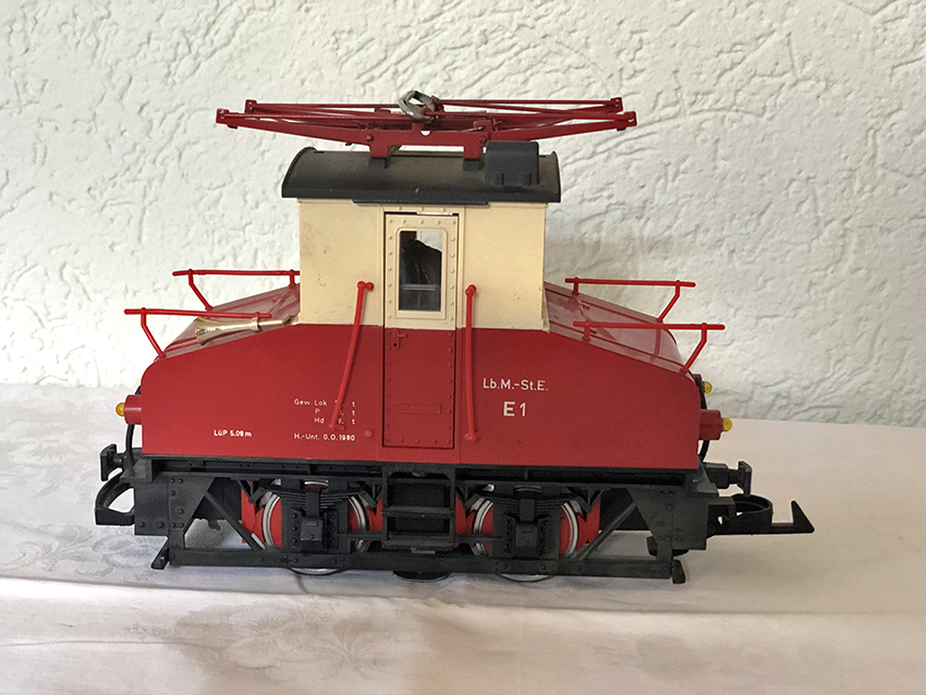 Electric locomotive “E 1” of the Landesbahn Mixnitz - St. Erhard (LGB no. 2032), red/beige, optionally to be used with overhead or catenary. Built in 1971. The model was also available entirely in red under LGB no. 2033.